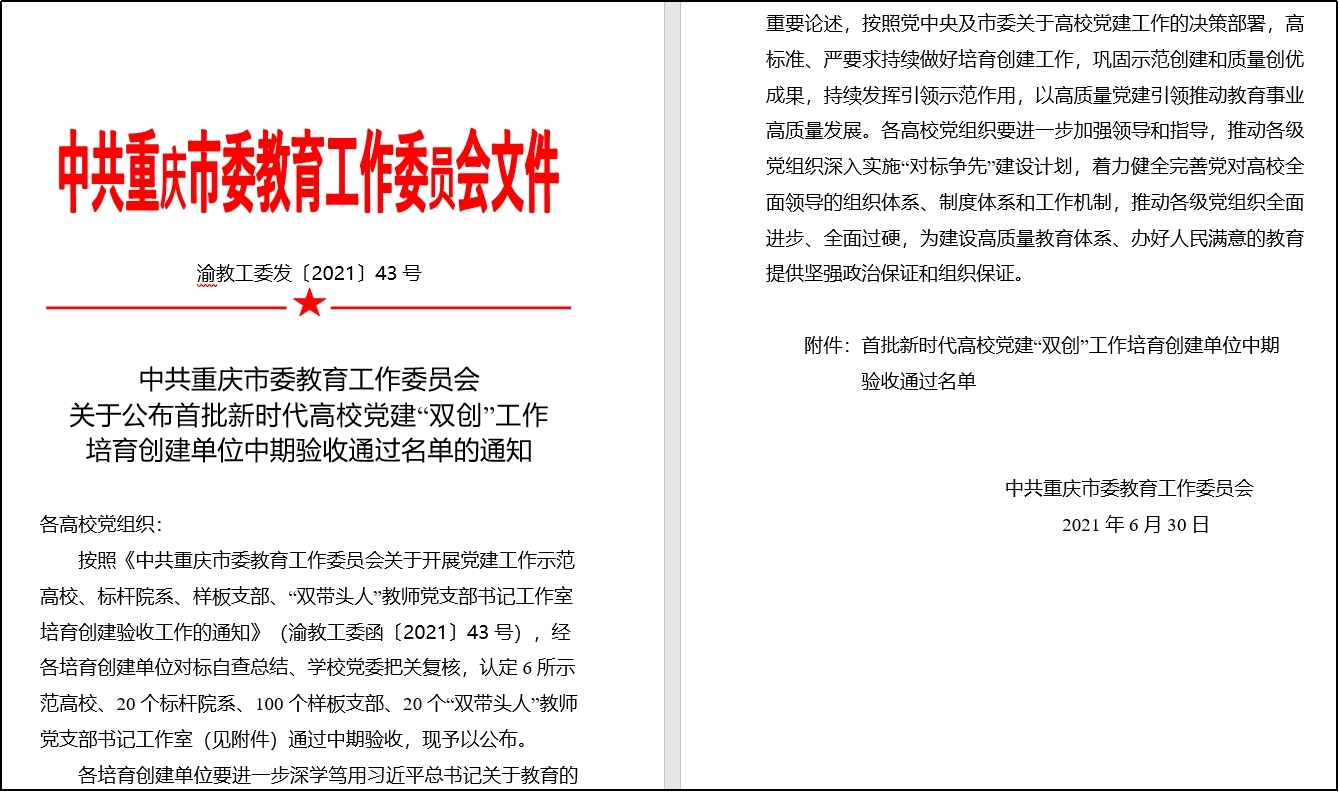 近日,重庆市教委发布了关于公布首批新时代高公司党建“双创”工作培育创建单位中期验收通过名单的通知,必赢76net线路官网教工第一党支部顺利通过全市首批样板支部培育单位中期验收。