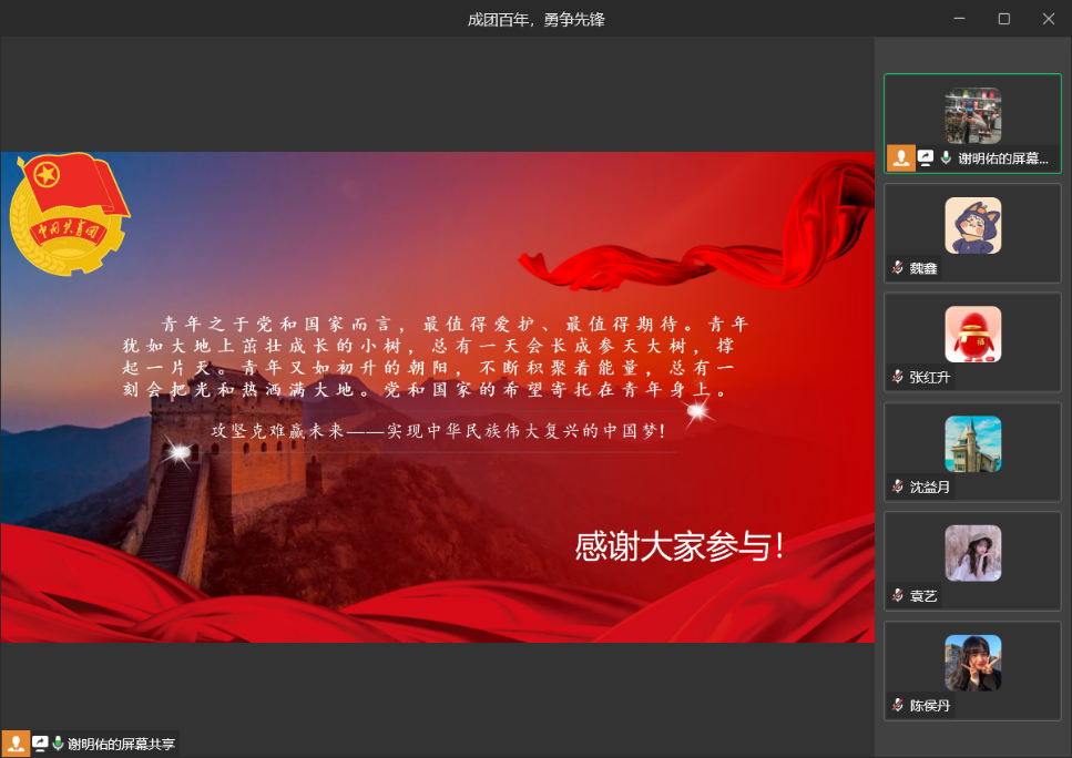 5月20日晚上7点,必赢76net线路官网员工党服工作站携手员工党支部,采用线上观影交流学习的方式,学习习近平总书记在庆祝中国共产主义青年团成立100周年大会上的重要讲话精神。公司陈春洁副书记带领与会入党积极分子和师生党员话心得、谈感想,切实让习总书记重要讲话精神入脑、入心。本次活动机械工程公司党服工作站130余名同学参加了会议。