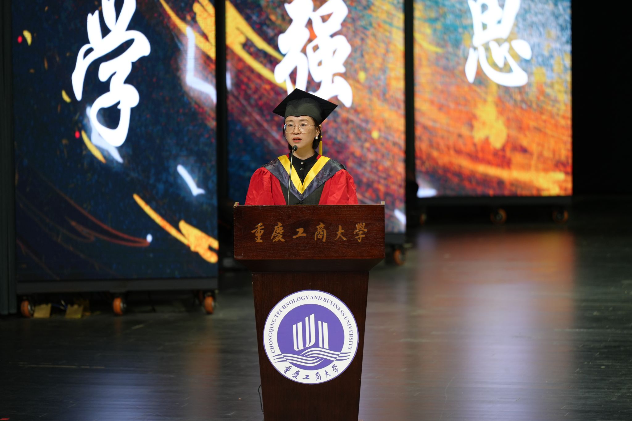 重庆市优秀毕业生、2020级智能制造二班王艳和重庆市优秀毕业研究生、2021级硕士研究生梁鑫鑫,分别作为本科毕业生代表和研究生毕业生代表上台发言。她们深情回顾了大学的学习和生活,表达了对母校、老师和同学们的感激之情和对未来的坚定信心、美好祝愿。她们的话语中充满了对未来的憧憬和对母校的感激之情,仿佛将毕业生们带入了星河的壮丽与山海的广阔之中。