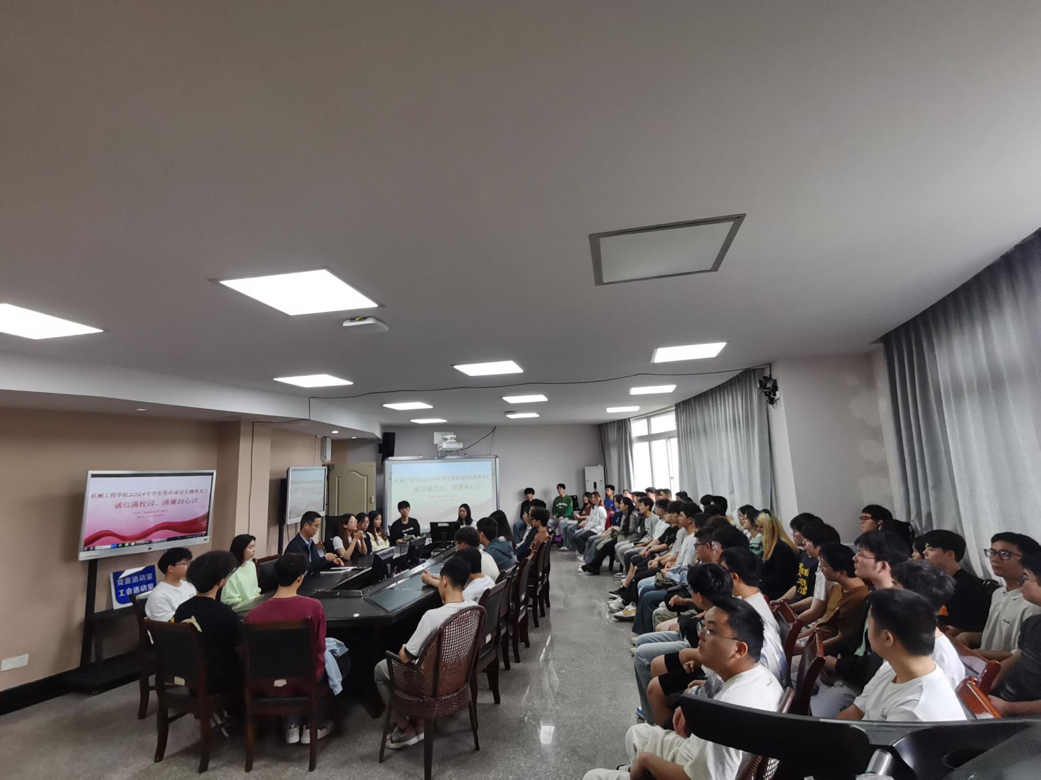 随后,陈春洁从感恩、诚信、清廉三个方面开展教育。首先,他强调同学们作为国家多年以来资助政策安排的直接受益者,应懂得知恩、感恩和报恩,每一年,国家安排财政资金直接资助700多亿元,安排助学贷款贴息100多亿元,安排临时困难补助和各种项目资助也是不小的数目,党和国家这种种的制度安排,保证了每一同学不因为资金困难而错过可以接受的高等教育。各位同学应懂得感恩党和国家的资助,助力了大家更好地发展与成长,更希望大家未来能传递这种恩情,切实落实感党恩、听党话,跟党走!其次,作为机械工科员工,要结合学科专业特点,树诚信意识,一步一个脚印诚实守信地走好职业生涯路,特别强调诚信、责任和担当这三个机械工程伦理的关键词,同时提醒有助学贷款的毕业生,要做到诚信还贷,共同打造诚信校园!最后,陈春洁着重给同学们强调了廉洁文化建设的必要性和重要性,引导同学们从现在开始、从身边事开始提高廉洁认识,积极将廉洁文化教育纳入自身成长成才全过程,踏实做事,清廉做人。