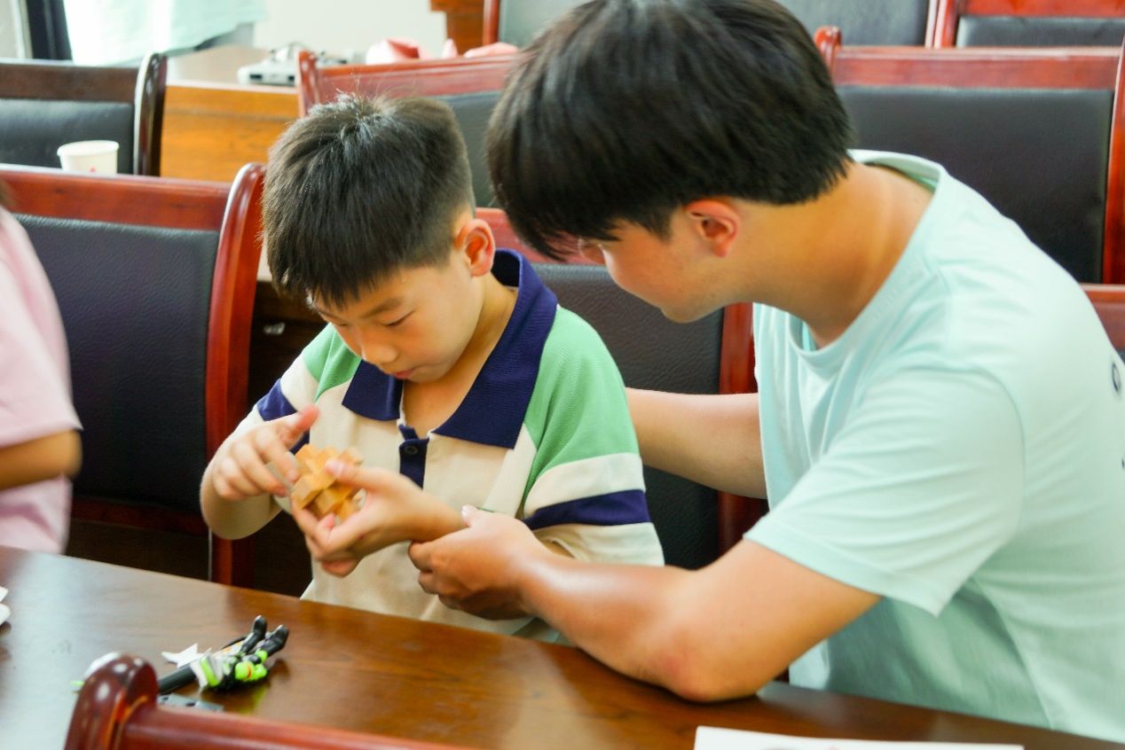 随后,明世成老师引入了鲁班锁这一蕴含古代智慧的传统玩具,并详细介绍了其背后的文化意义与构造原理。为了让青少年们亲身体验鲁班锁的奇妙之处,每位青少年都获得了一个精心准备的鲁班锁。在团队成员的耐心指导和鼓励下,青少年们纷纷动手尝试解开这一古老谜题。经过一番努力,当第一个鲁班锁被成功拆解并重新组装时,现场爆发出阵阵欢呼声和成就感满满的笑容。