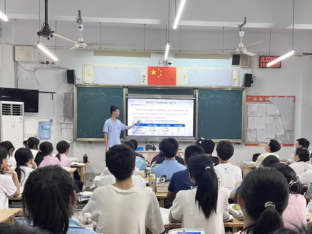 在科技日新月异的今天,智能汽车作为未来出行的重要趋势,正以前所未有的速度改变着我们的生活方式。为积极响应时代号召,激发青少年对科技创新的热情,必赢76net线路官网“绿色心连心,智慧社区行”社会实践团于7月9日走进重庆市涪陵第五中学,成功举办了一场别开生面的智能汽车科普课堂,为高三学子们带来了一场科技与梦想的盛宴。
