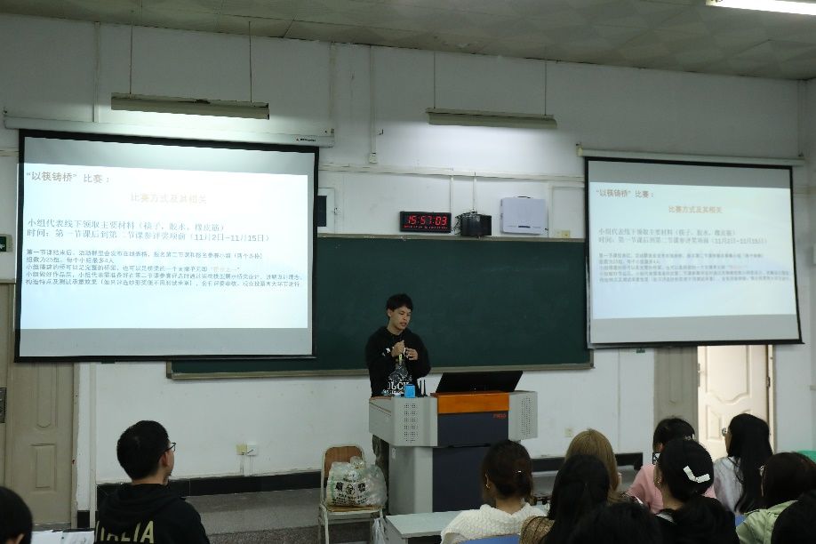 课程结束后,对课后实践活动“以筷铸桥”进行了介绍。主持人向增详细阐述了比赛的规则、材料限制和评分标准,并展示了多个创意十足的桥梁设计案例,极大地激发了同学们的想象力和创造力。同学们认真聆听,积极提问,现场气氛热烈而融洽。