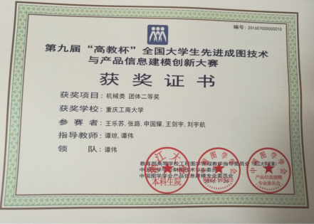 2016年7月23—26日,第九届“高教杯”全国老员工先进成图技术与产品信息建模创新大赛在山东理工大学举行,公司必赢76net线路官网王乐苏、张路、申国耀、王剑宇、刘宇航等五位同学组成的代表队在谭伟、谭琼老师的指导下,荣获机械类“团体二等奖”的优异成绩,同时获得个人全能一等奖1项,个人全能二等奖2项,个人建模一等奖2项,两位老师获得优秀指导教师奖。