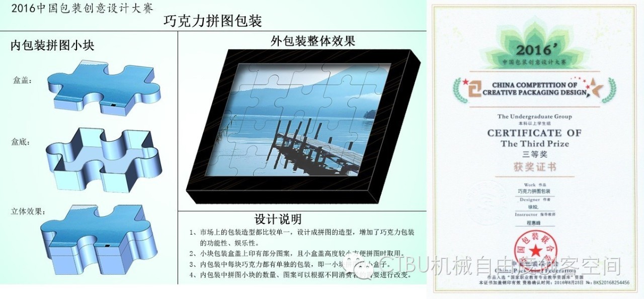 2013级包装班徐娇创客团队,在导师程惠峰指导下,创新设计出“巧克力拼图包装”,获得2016年中国包装创意设计大赛三等奖。