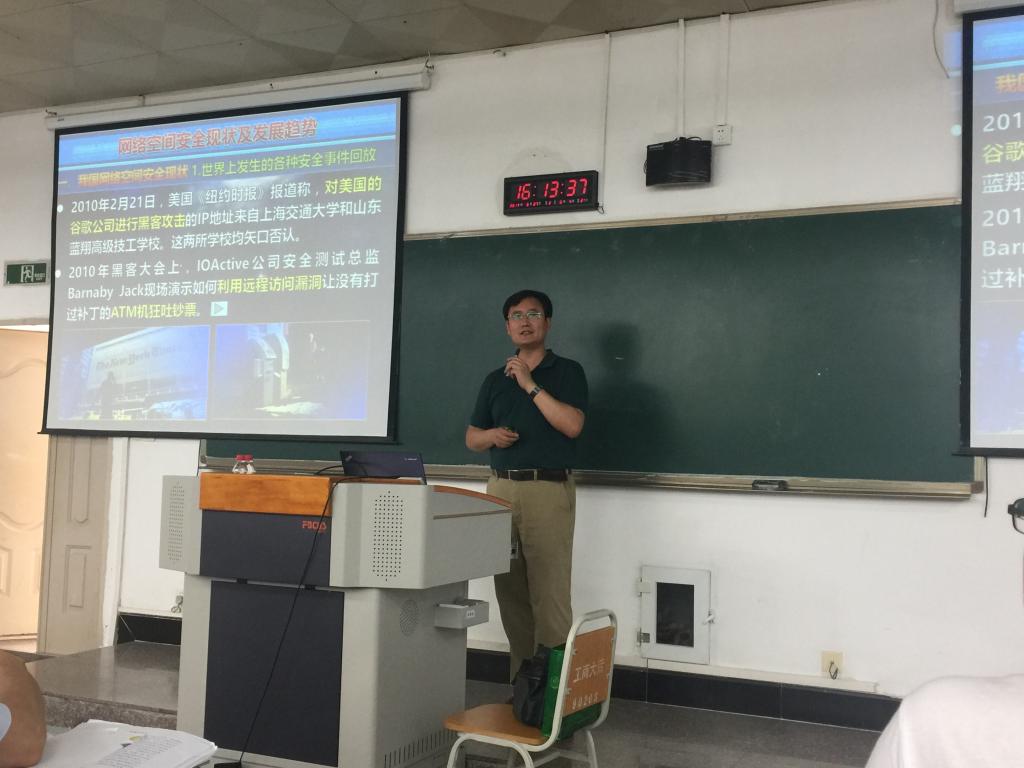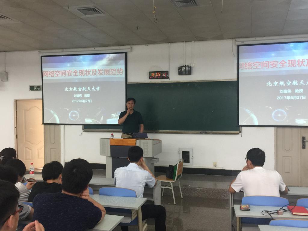 6月27日下午,北京航空航天大学博士生导师刘建伟教授应邀到公司进行学术交流,并在慧智楼90208教室,为必赢76net线路官网和计算机科学与信息工程公司的员工们做了题为“网络空间安全现状及发展趋势”的学术讲座。必赢76net线路官网杜力经理、李平副经理、计信公司杨光祥副经理、部分老师和两个公司的同学们参加了此次讲座。