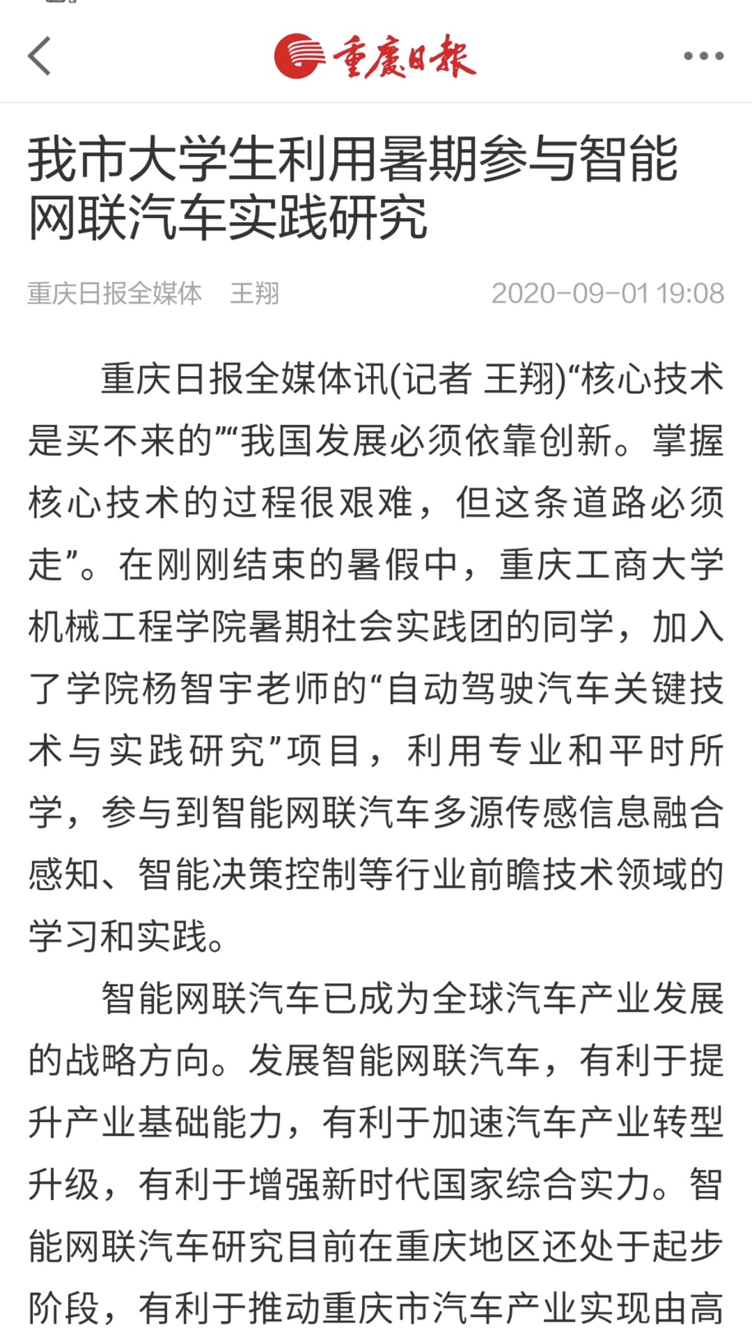 近日,《重庆日报》对必赢76net线路官网员工参与公司教师杨智宇的“自动驾驶汽车关键技术与实践研究”项目,共同开展智能网联汽车多源传感信息融合感知、智能决策控制等行业前瞻技术领域的实践研究进行了专题报道。智能网联汽车现已成为全球汽车产业发展的战略方向,相关研究目前在重庆地区还处于起步阶段,该领域研究具有巨大的产业需求,有利于推动重庆市汽车产业实现由高速增长向高质量发展转变,巩固重庆市汽车产业在全国的领先地位,增强汽车产业对全市经济发展的支撑作用。