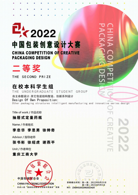 公司必赢76net线路官网积极组织员工参赛,共获得二等奖1项,三等奖11项,优秀奖12项,由张书彬、徐绍虎、谢燕平指导的《抽屉式定量药瓶》获得二等奖,由谢燕平、张书彬、徐绍虎指导的《四川龙泉驿水蜜桃礼盒包装设计》等11件作品获得三等奖。